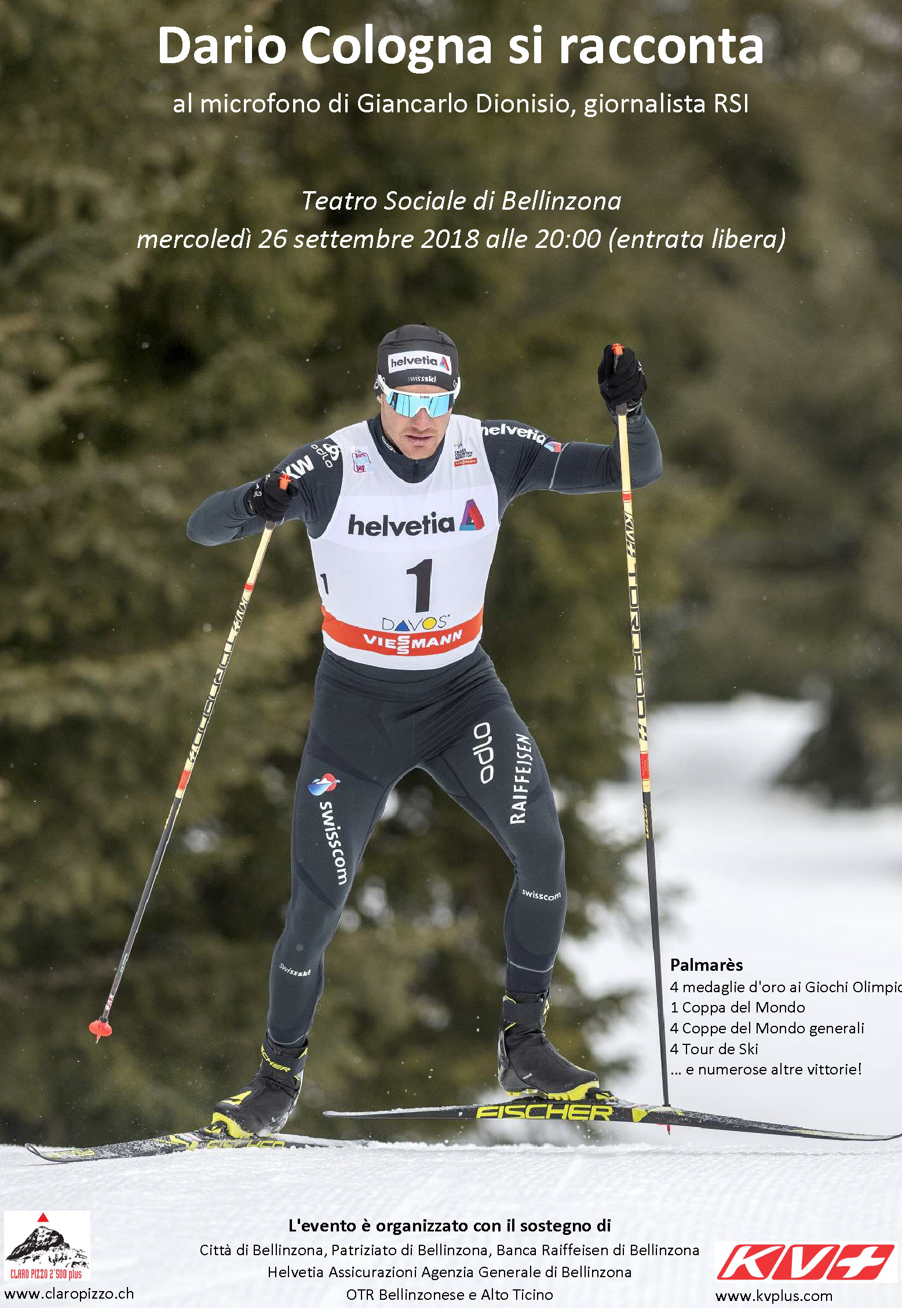 Moderatore sarà il giornalista sportivo RSI Giancarlo Dionisio, che ci aiuterà a capire i segreti dei trionfi di Dario, vincitore di quattro medaglie d’oro olimpiche, quattro coppe del mondo generali, quattro Tour de Ski e numerosi altri titoli e medaglie.